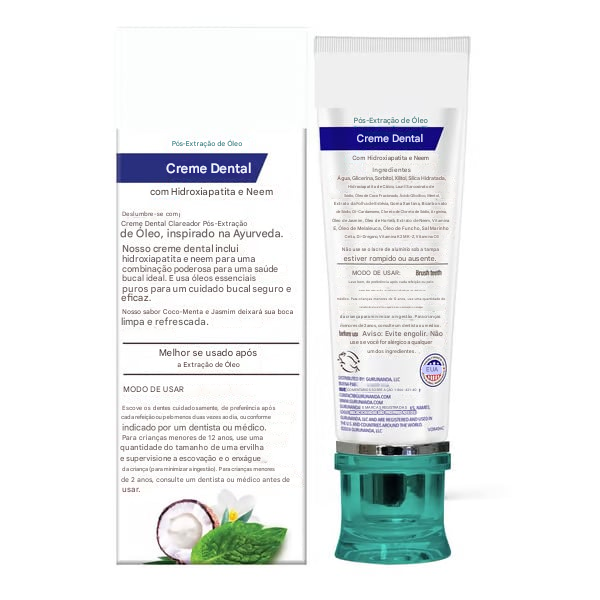 INGREDIENTES NATURAIS: Esta pasta de dente combina extratos de neem, jasmim, cravo, cardamomo e óleos de orégano, com vitaminas D3, E e K2. O frescor mentolado revitaliza o hálito, tornando-a indispensável.